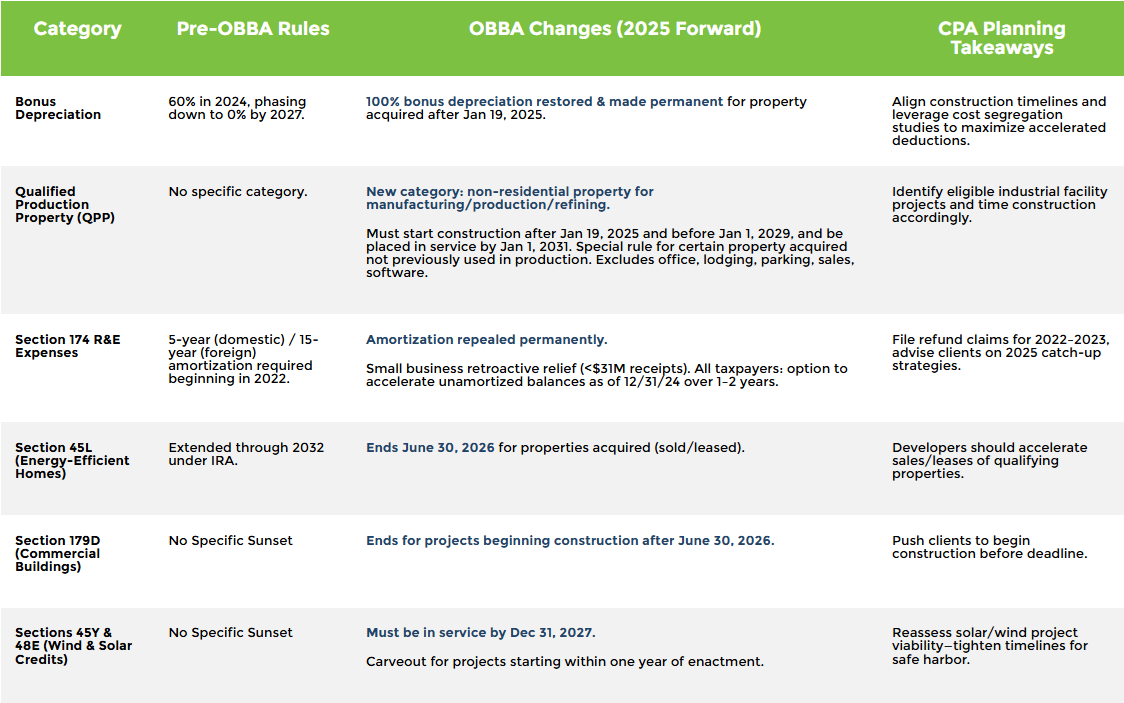 The comparison chart below highlights the key before-and-after rules and outlines the planning takeaways CPAs should discuss with clients to ensure they capture benefits before deadlines close.